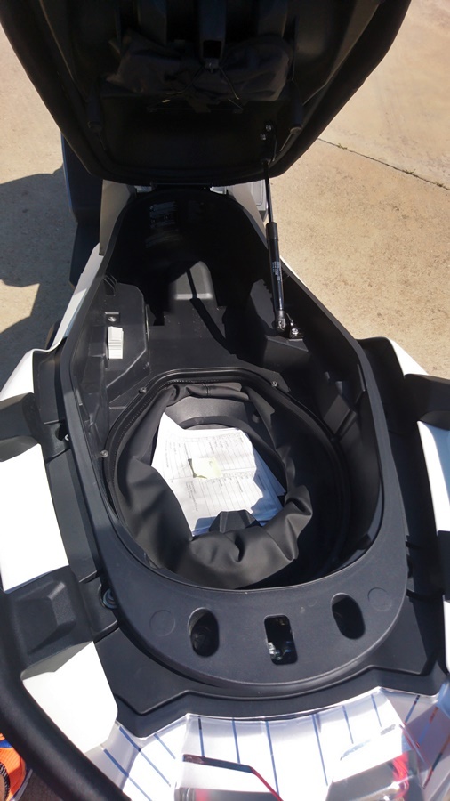 El cofre bajo el asiento es muy largo pero no estaca por su capacidad, disponemos de espacio para un casco jet y cuando está parada la moto, desplegamos el sistema «flexcase», y nos entra un casco integral.